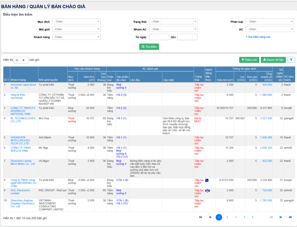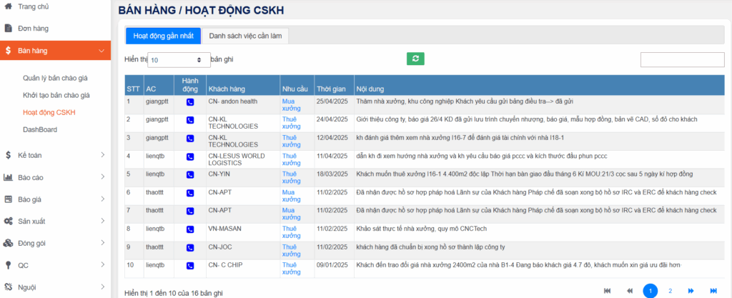 - Bán hàng: Quy trình bán hàng từ lúc khách hàng liên hệ đến khi kết thúc (thành công hoặc dừng chăm sóc). Lưu trữ tất cả các hoạt động CSKH của AC trong toàn bộ quá trình: Gọi điện, email, gặp